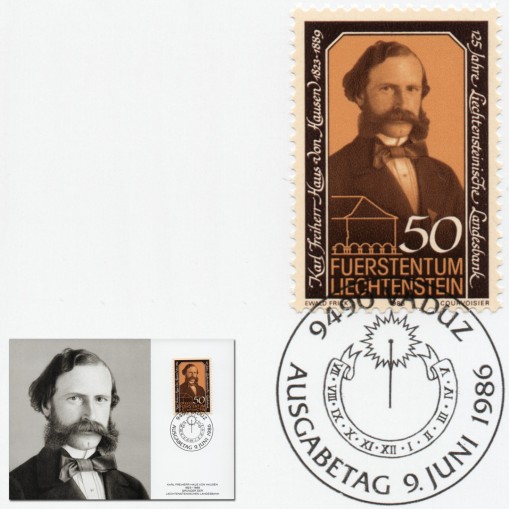 Na znaczku i karcie widnieje założyciel banku, Karl Freiherr Haus von Hausen.