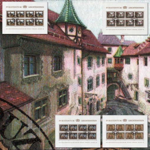 Kasowana grzecznościowo seria w arkuszach upamiętniająca 40. rocznicę wstąpienia na tron księcia Franciszka Józefa II.