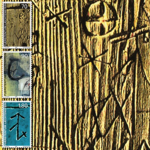 Na znaczkach widnieją znaki na drzwiach, na ścianie i na toporze.