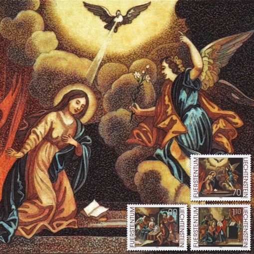Na znaczkach widnieją obrazy Josefa Walsera z kaplicy Matki Boskiej Pocieszycielki w Dux (Schaan) przedstawiające zwiastowanie, narodziny Chrystusa i ofiarowanie Jezusa w świątyni.
