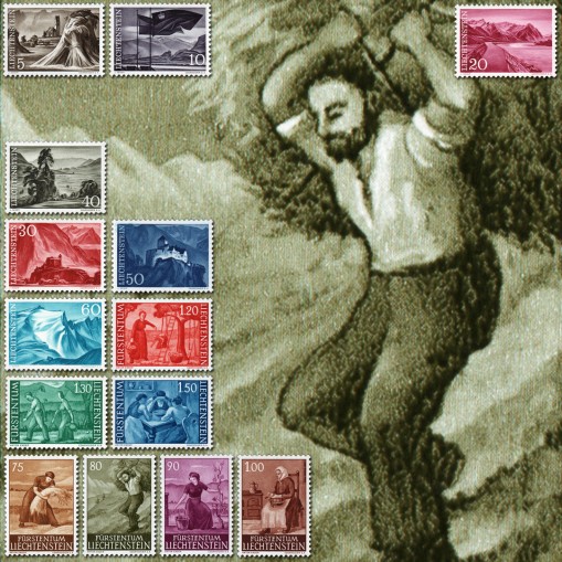 Seria obiegowa, na znaczkach której widnieją pejzaże z Liechtensteinu oraz sceny z tradycyjnego życia na wsi, kolejno: