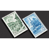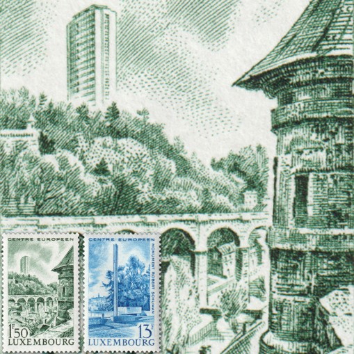 Na znaczkach widnieje kolejno: budynek Kirchberga z mostem kolejowym oraz pomnik Roberta Schumana.