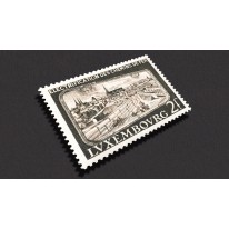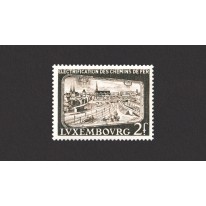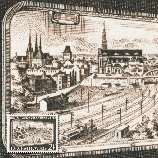 Znaczek nagłaśniający elekryfikację sieci kolejowych w Luksemburgu.