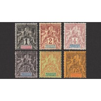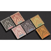 Na znaczkach widnieje alegoryczny obraz „nawigacji" i „handlu" (ang. Navigation and Commerce). Projektantem był Louis-Eugène Mouchon.