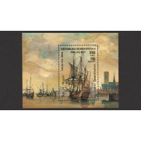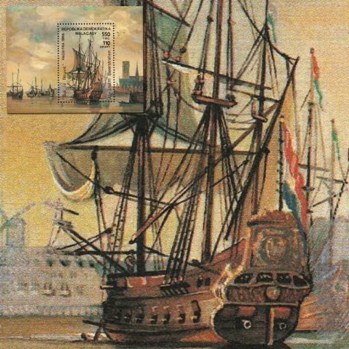 Znaczek w bloku, na którym widnieje obraz Abrahama Beerstratena zatytułowany „Na rzece”.