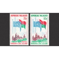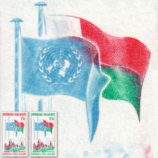 Na znaczkach przedstawiono flagi Madagaskaru oraz ONZ, powiewające nad budynkami rządowymi w Antananarywie (dawniej Tananarywie).