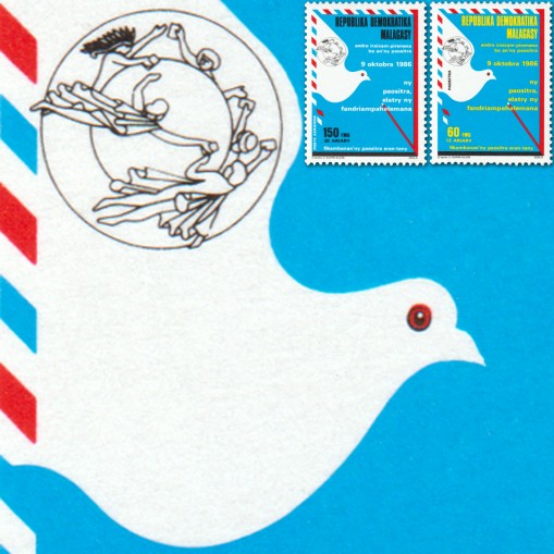 Znaczki upamiętniające Światowy Dzień Poczty. Widnieje na nich gołąb i przedstawienie pomnika Światowego Związku Pocztowego (ang. Universal Postal Union - UPU) w stolicy Szwajcarii Bernie.
