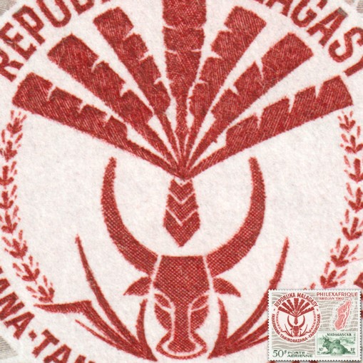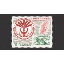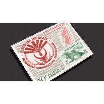 Na znaczku widnieją herb Madagaskaru, mapa kraju i znaczek z 1946 roku.