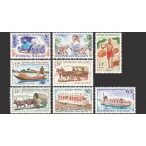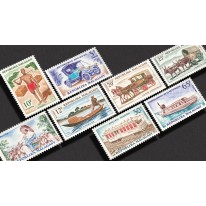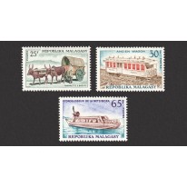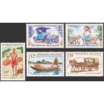 Na znaczkach widnieją różne formy transportu pocztowego na przestrzeni wieków: tragarz, łódź, dyliżans pocztowy, wóz ciągnięty przez woły, wczesny samochód, lektyka, kolejowy wagon pocztowy i wodolot.
