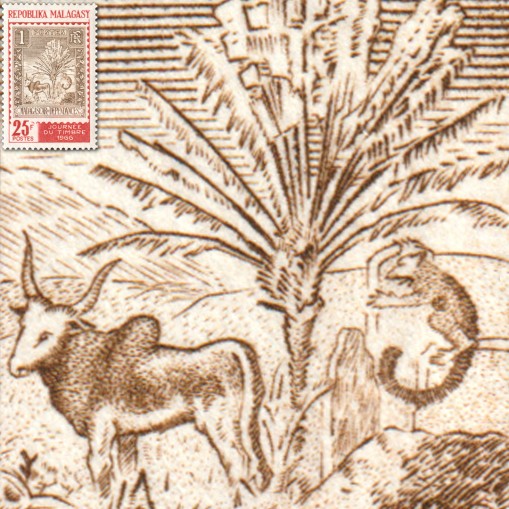 Na znaczku widnieje reprodukcja znaczka obiegowego z 1903 roku, przedstawiającego pielgrzan madagaskarski („drzewo podróżników”), a przy jego pniu zebu (gatunek bydła hodowlanego) oraz lemura.