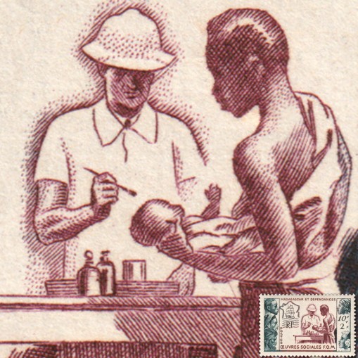 Znaczek z dopłatą przeznaczoną na kolonialny fundusz pomocy (ang. Colonial Welfare Fund, fr. Oeuvres Sociales de la France d’Outre-mer). Widnieje na nim lekarz badający dziecko.