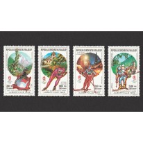 Na znaczkach i blokach widnieją następujące dyscypliny sportowe obok krajobrazów alpejskich: