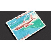 Na znaczku widnieje samolot Boeing 737 Madagaskarskich Linii Lotniczych podczas lotu.