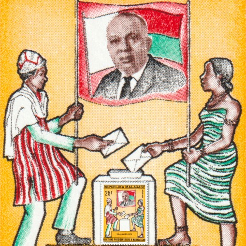Jest to znamienny walor, bowiem pomimo głoszenia demokratyczności, na znaczku widnieje portret tylko jednego kandydata, czyli urzędującego prezydenta Philiberta Tsiranana. Tym samym, znaczek dokumentuje do jakiego absurdu może posunąć się upolitycznianie różnych form masowego przekazu - radia, telewizji, prasy czy nawet filatelistyki. Baner z wizerunkiem prezydenta jest podtrzymywany przez parę głosujących, jakby nikt nie pragnął głosować na kogokolwiek innego.