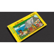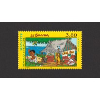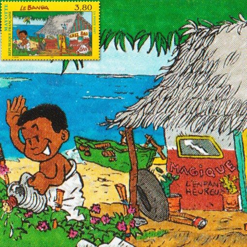 Na znaczku widnieje chłopiec podlewający kwiaty przed swoją chatą na plaży, znaną lokalnie jako „la banga”.