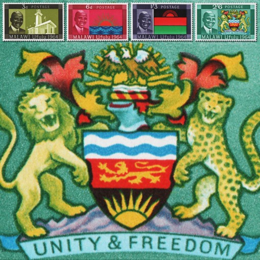 Na znaczkach, obok podobizny prezydenta imieniem Hastings Kamuzu Banda, widnieją kolejno: łuk triumfalny, zachodzące słońce ponad falami, flaga narodowa i herb państwa.
