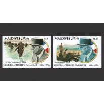 Na znaczkach widnieje portret generała obok scen lądowania w Normandii i jego wizyty na Madagaskarze.