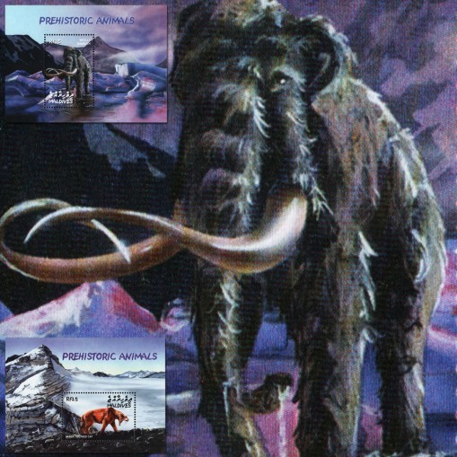 Komplet dwóch bloków, na których widnieją zwierzęta prehistoryczne: mamut i tygrys szablozębny.