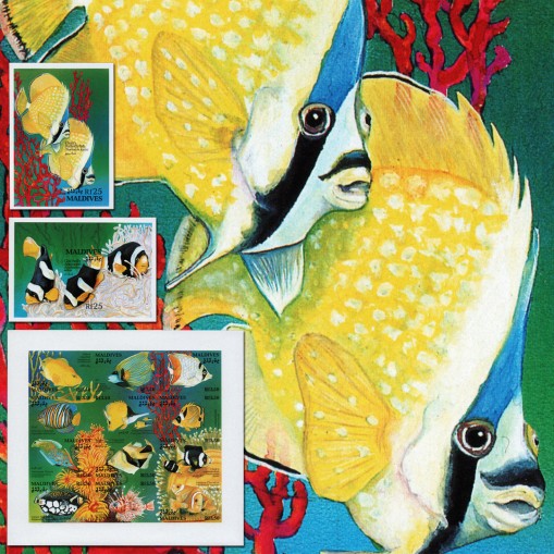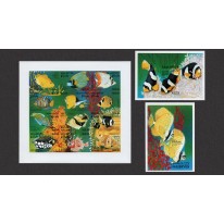 Seria w arkuszu i dwa bloki, na znaczkach których widnieją następujące gatunki ryb: