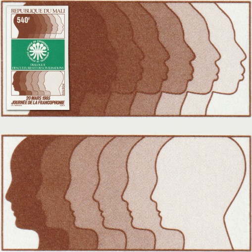Na znaczku przedstawiono twarze o różnych odcieniach skóry, logo agencji i napis Dialogue des cultures et des civilisations (dialog kultur i cywilizacji).