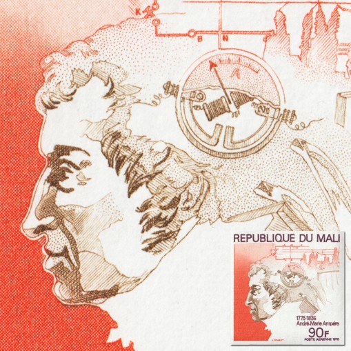 Znaczek upamiętniający 200. rocznicę urodzin francuskiego fizyka i matematyka imieniem André Ampère. Zajmował się on m.in. badaniem zjawiska elektromagnetyzmu, a od lego nazwiska jednostkę natężenia prądu elektrycznego w układzie SI nazwano amper.