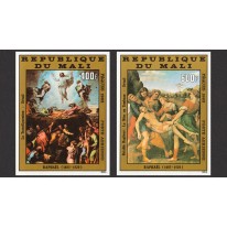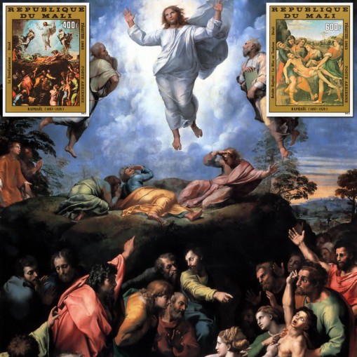 Na znaczkach widnieją dzieła Rafaela zatytułowane „Przemienienie Pańskie” i „Złożenie do grobu”.