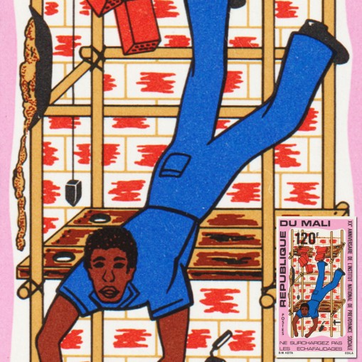 Na znaczku widnieje robotnik budowlany spadający z rusztowania.