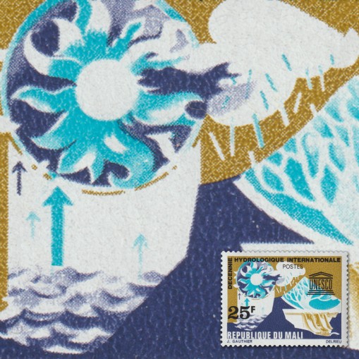 Na znaczku przedstawiono wyobrażenia obiegu wody w atmosferze i logo UNESCO.