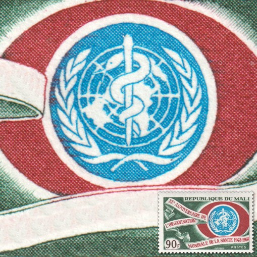 Znaczek wydany z okazji 20. rocznicy Światowej Organizacji Zdrowia (ang. World Health Organization - WHO). Na znaczku widnieje logo WHO - przedstawiona na tle mapy świata i otoczona wieńcem laurowym laska Eskulapa, stanowiąca symbol medycyny.