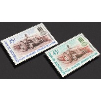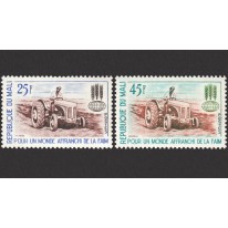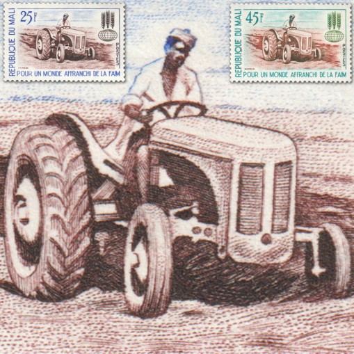 Znaczek promujący walkę z głodem na świecie. Na znaczku przedstawiono traktor oraz symbol kłosów zboża i ziemskiego globu.