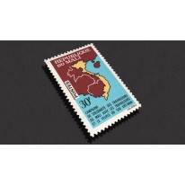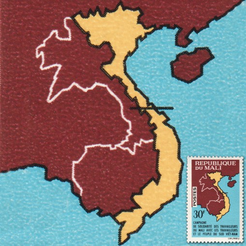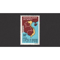 Znaczek promujący solidarność ludzi pracy w Mali z ludzmi pracy i mieszkańcami Wietnamu. Znaczek przedstawia mapę Azji południowo-wschodniej z zaznaczonym na niej Wietnamem.