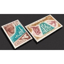 Na znaczkach przedstawiono głowy byka, kurczaki i przyrządy laboratoryjne.