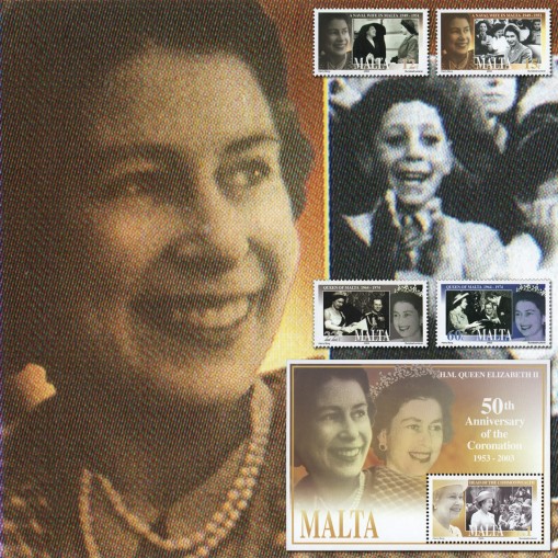 Na znaczkach widnieje monarchini rozmawiająca z Carmelą Agius, podczas wizyty na wyspie Gozo, podczas otwarcia parlamentu maltańskiego w 1967 roku, z premierem Malty Georgiem Borg Olivierem oraz na ulicach Valletty w 1992 roku.