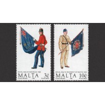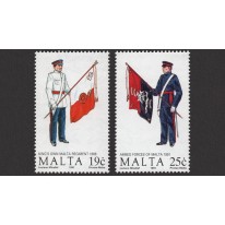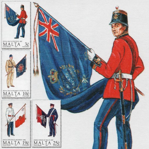 Na znaczkach widnieją mundury oficerów niosących flagi następujących maltańskich formacji wojskowych: