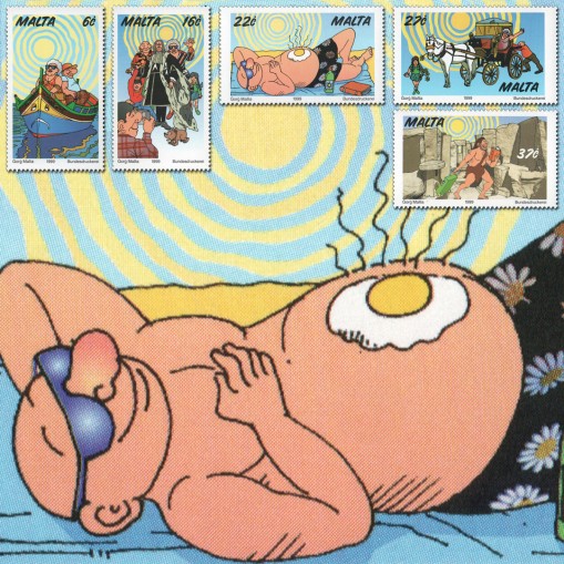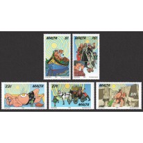 Na znaczkach widnieją kolejno: rejs łodzią, zdjęcie urlopowe, opalanie się, przejażdżka bryczką i zwiedzanie zabytków.