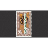 Na znaczku widnieją symbole przemysłu i rolnictwa: koła zębate i kłosy zboża, oraz postaci ludzkie: czarna i biała.