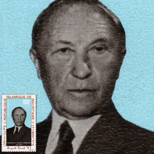 Znaczek wydany z okazji pierwszej rocznicy śmierci Konrada Adenauera, kanclerza Republiki Federalnej Niemiec w latach 1949–1963.