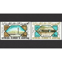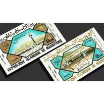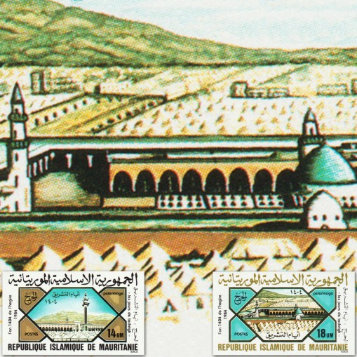 Na znaczkach przedstawiono budynki meczetów i dziedzińce przed świątyniami, zapełnione namiotami pielgrzymów.