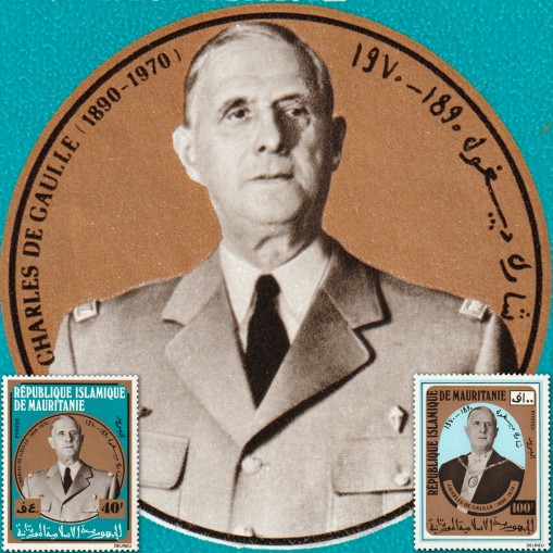 Znaczki upamiętniające generała Charlesa de Gaulle’a (1890-1970). Widnieją na nich jego portrety: w mundurze i jako prezydenta Francji.