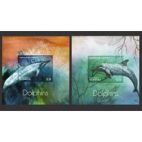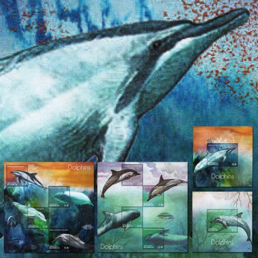 Seria w dwóch arkuszach i dwa bloki, na znaczkach których widnieją następujące gatunki delfinów: