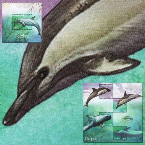 Seria w arkuszu i blok, na znaczkach których widnieją następujące gatunki delfinów: