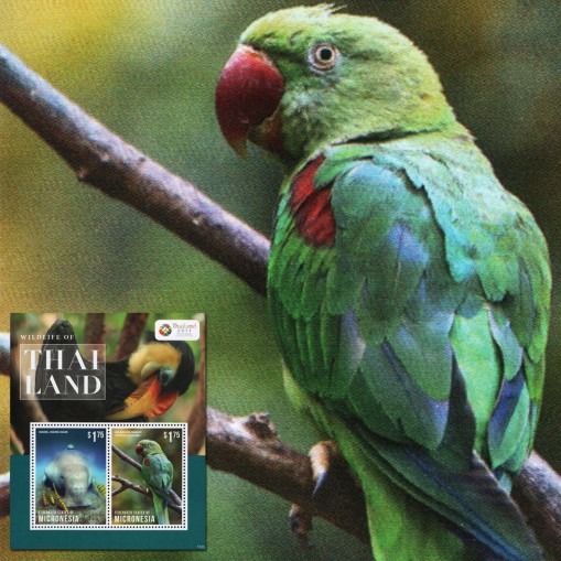 Na znaczku widnieją diugoń przybrzeżny i aleksandretta różana.