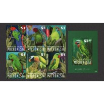 Seria i blok, na znaczkach których widnieją następujące gatunki papug: