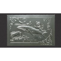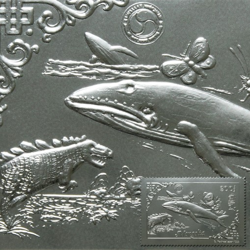 Na znaczku widnieją: wieloryb, motyle i dinozaur.