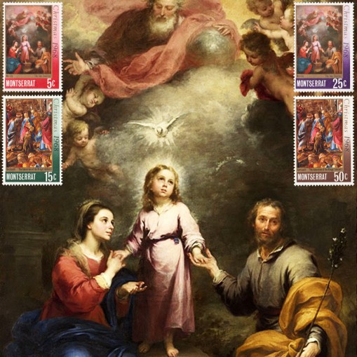 Na znaczkach widnieją reprodukcje dzieł malarstwa włoskiego, kolejno: „Dwie Trójce” (Murillo) i „Pokłon Trzech Króli” (Botticelli).