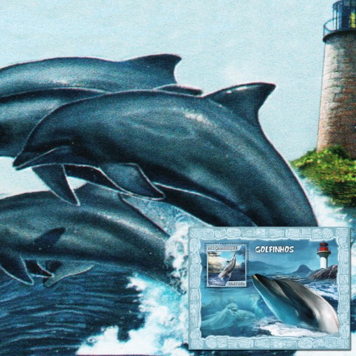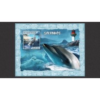 Znaczek w bloku, na którym widnieje latarnia morska i delfinek długoszczęki.