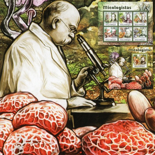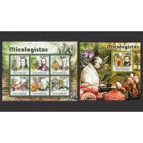 Arkusz i blok, na znaczkach których widnieją słynni mykologowie i następujące gatunki grzybów: