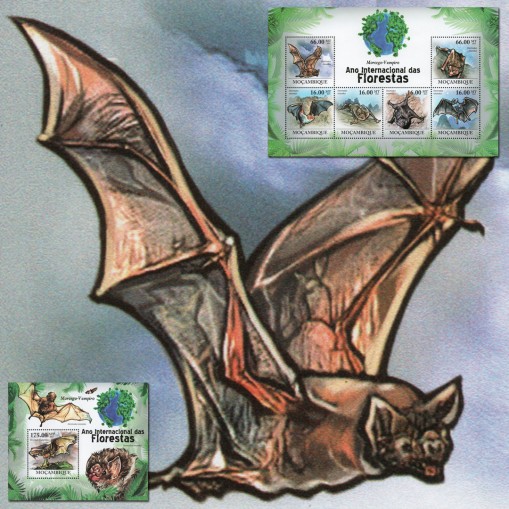 Seria w arkuszu i blok, na znaczkach których widnieje nietoperz wampir zwyczajny.