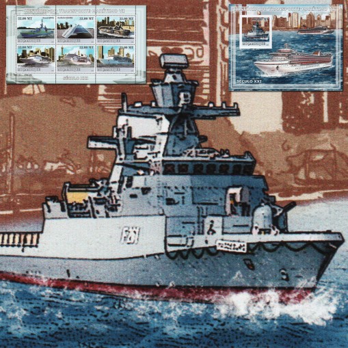Na znaczkach widnieją okręty wojskowe i wycieczkowce, kolejno: „Surcouf”, „Sea Shadow”, korweta rakietowa na poduszce powietrznej typu Skjold, „Radiance of the Seas”, „Pacific Princess”, „Mariner of the Seas” i F261 Magdeburg.