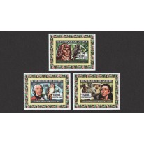 Zestaw trzech nieautoryzowanych znaczków w bloczkach przedstawiających słynnych ornitologów: Johna Jamesa Audubona, François Levaillanta i Georgesa-Louisa Leclerc de Buffona.